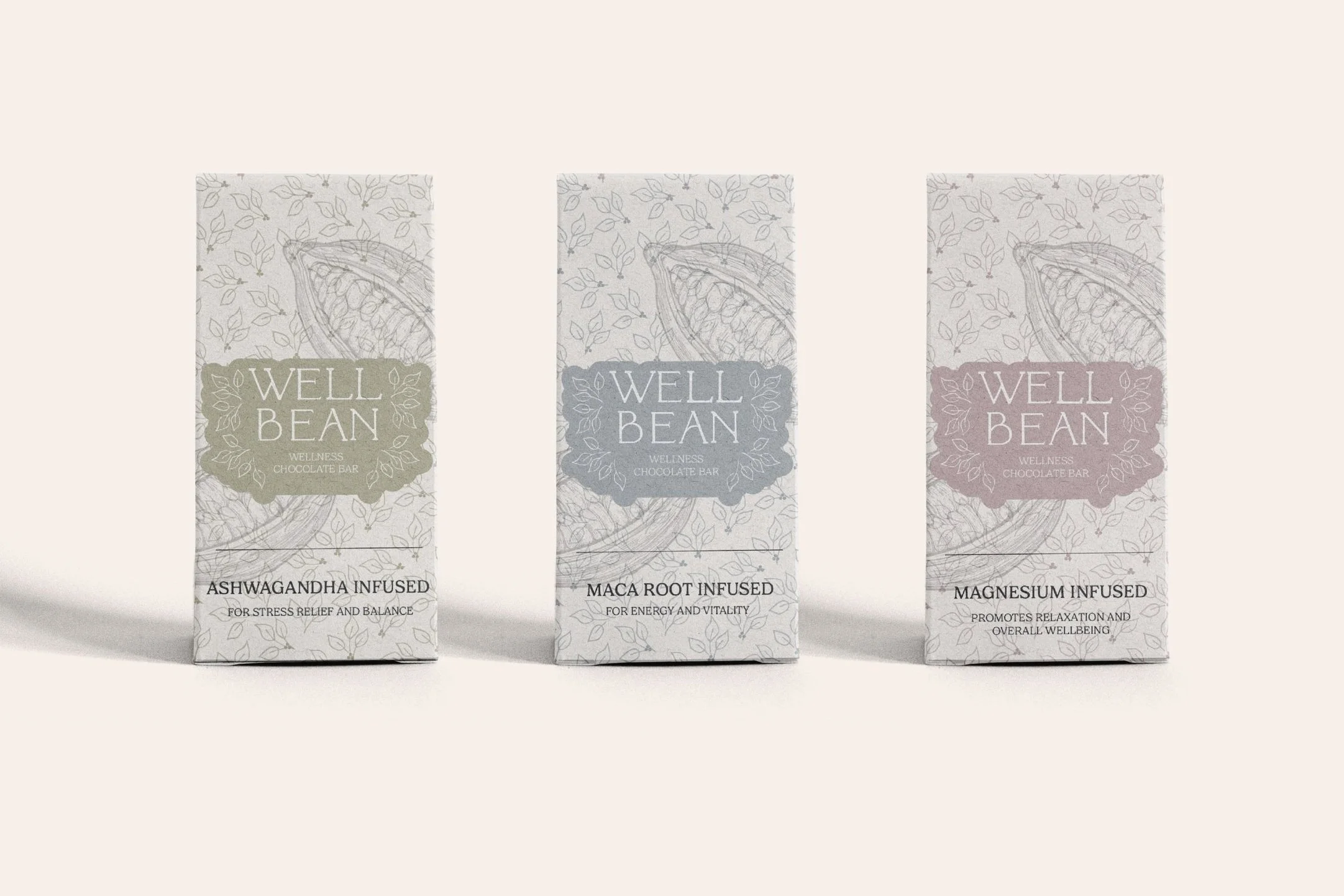 The brand I created is called WellBean : a wellness-focused chocolate bar brand designed for individuals who prioritize mindfulness and natural living. Featuring three distinct bars, each crafted with functional ingredients; ashwagandha for stress relief, maca root for energy, and cacao with magnesium for mood enhancement. Wellbean combines indulgence with health benefits. Targeted at health-conscious consumers who frequent yoga studios, spas, and natural food establishments, the brand delivers a mindful snacking experience that supports well-being.